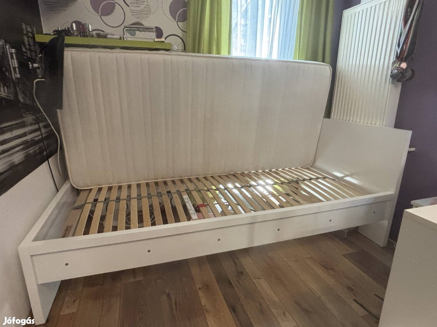 90x200 - as egyszemélyez ágy, ágyráccsal és matraccal eladó. 1 éves, a rácstartó léceket kapupánt csavarral megerősítettem.