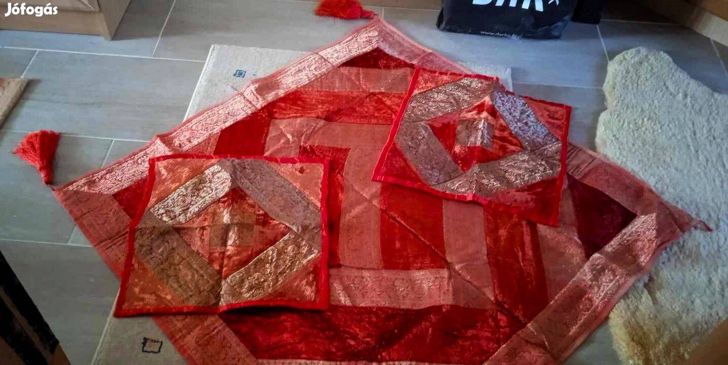 Arany-piros színű indiai brokát-bársony terítő szett