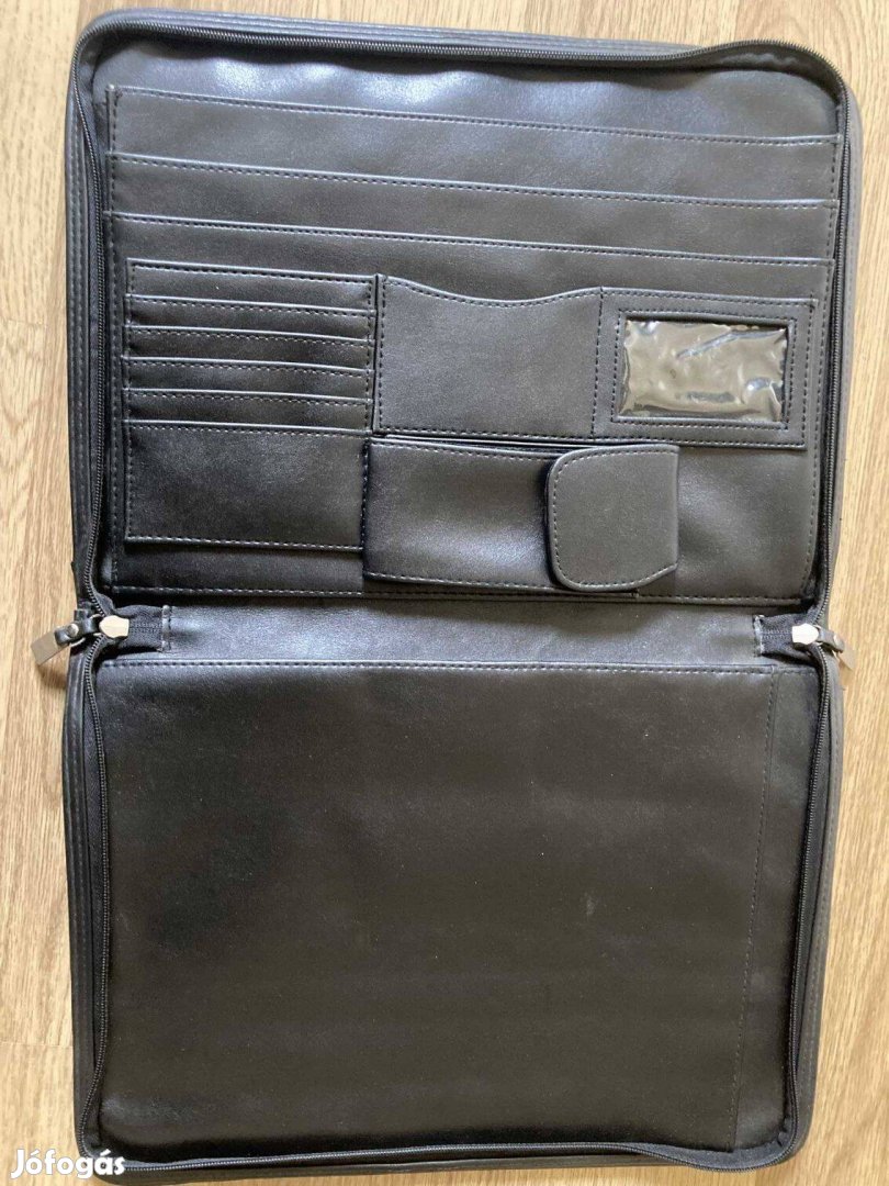 A4-es méretű dokumentumok bőven beleférnek (4 nagy tároló rekesz) + több kis zseb kártyáknak és egyéb cetliknek + 1 külső cipzárral ellátott tároló rész.