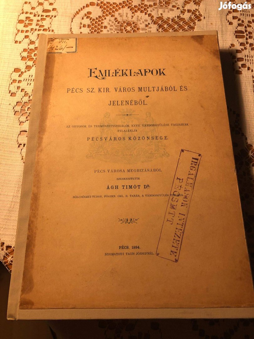 Dr. Ágh Timót: Emléklapok Pécs sz. kir. város múltjából és jelenéből 1894. 261 oldal, a város története és akkori jelene: lakosság, közlekedés, ipar, kultúra, természet, stb. Későbbi vászonkötés eredeti borító felhasználásával.