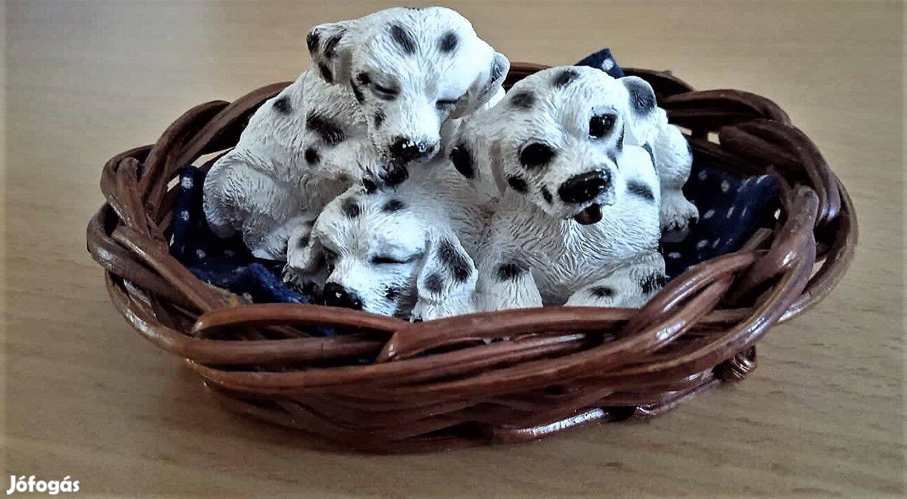 Élethű polirezin figurák, mini Dalmata kölyökkutya alom, kosárban