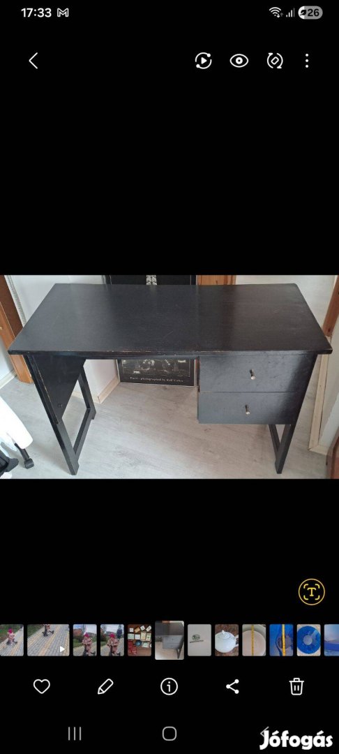 Feketére festett fából készült íróasztal fiókokkal.