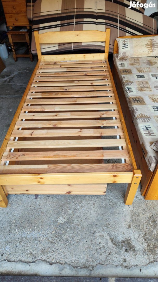 Eladó a képeken látható 90 * 200 cm-es fenyő ágy, ágyneműtartóval, két matraccal, szép állapotban.