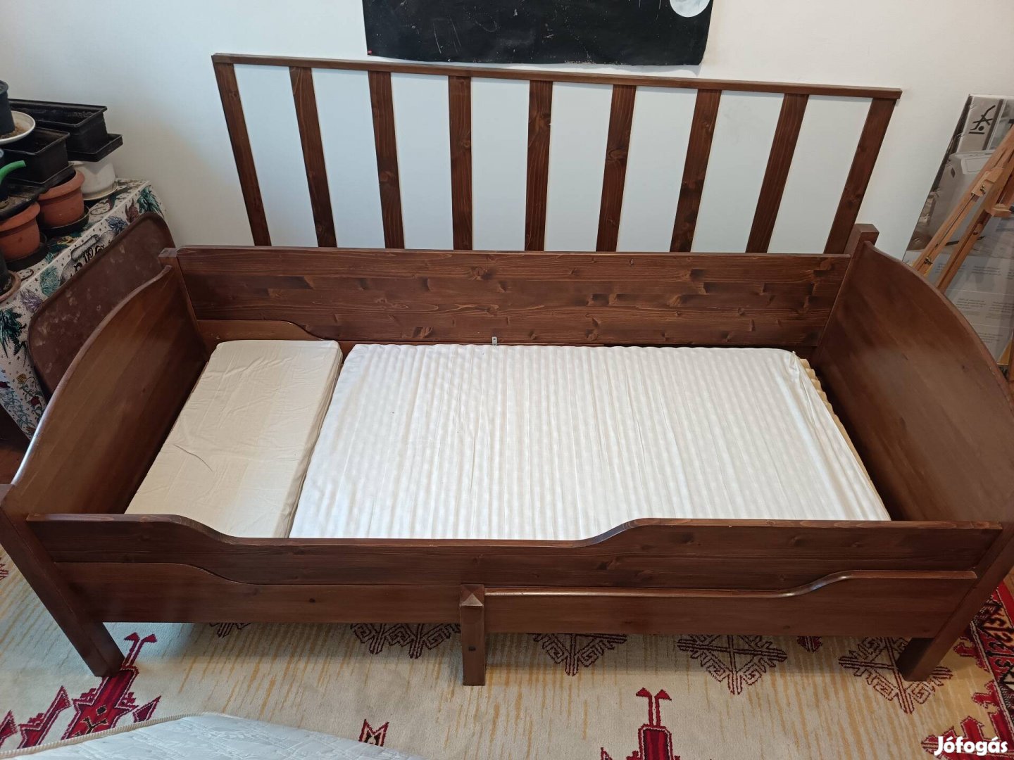 Újszerű állapotú pácolt fenyőfa gyerekágy (állítható)Helyileg Komlón 2 matraccal ...egy alacsony 2 darabos ha összébb van tolva kisgyereknek..és a tetejére rakható egész matrac.. ha széthúzva van 10 év feletti gyereknek úgy magasabb is