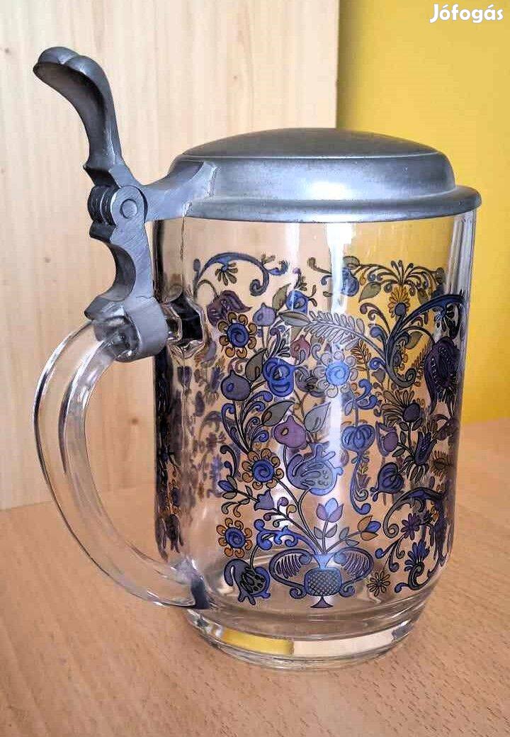 Festett, mintás üveg söröskorsó cin fedéllel