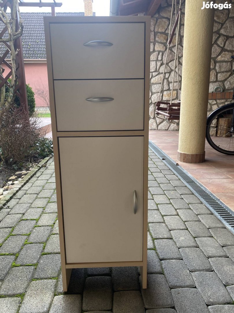 Alig használt fehér és bézs színű kis méretű fürdőszobai szekrény eladó. Méretek, magasság: 97cm / szélesség: 32,5cm / mélység: 29,5cm