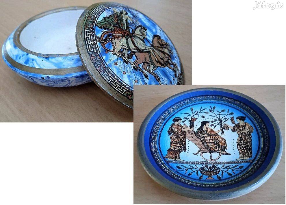 Görög kerámia bonbonier és gyűrűtartó, mitológiai jelenetekkel. Gyönyörű, a görög dísztárgyak jellegzetes színeivel. Új hibátlan termékek. Bonbonier: 9 cm az átmérője.