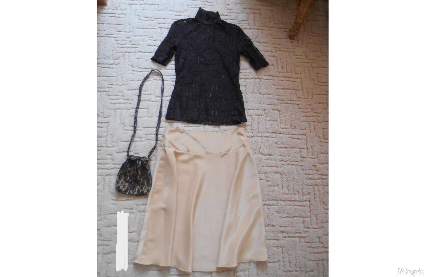 Pezsgőszínű gyöngyházselyem szoknya és spagettipántos felső, hozzá barna csipke felső is, hozzáillő kis csipke bugyorral, 36-38-as