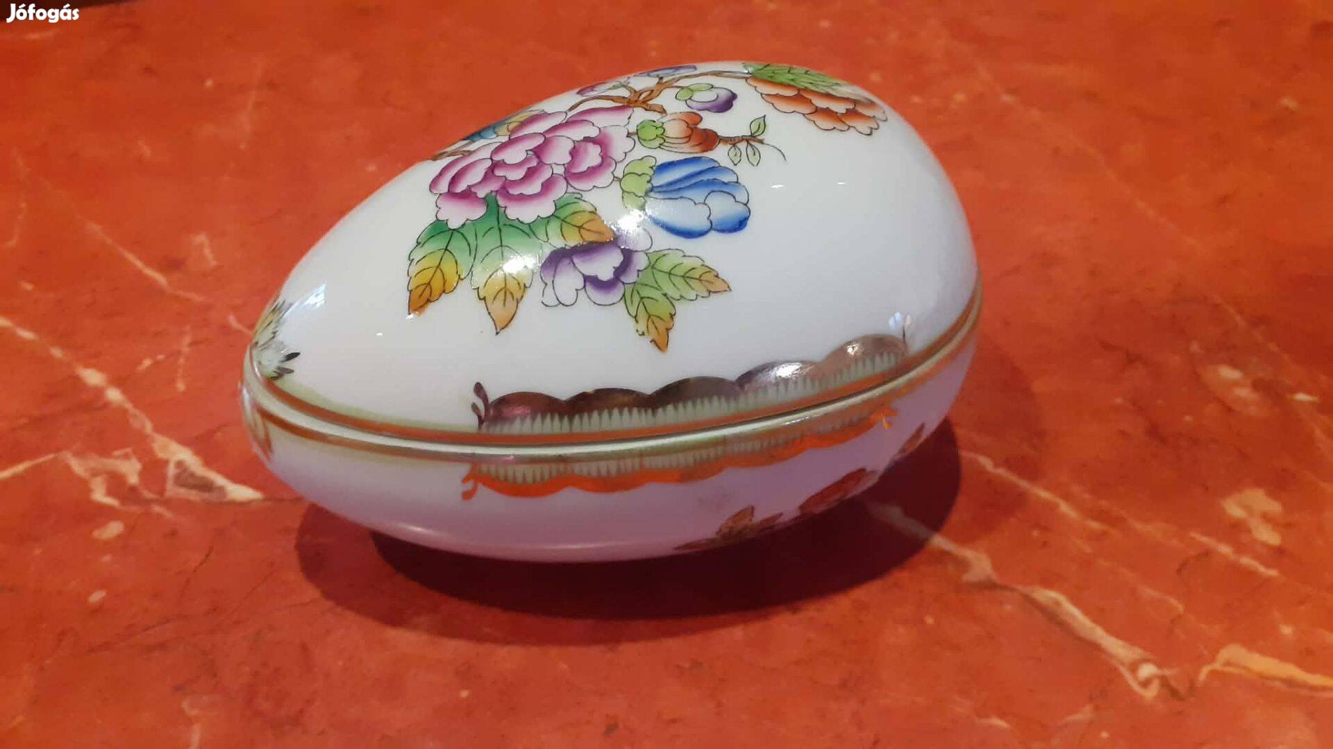 Herendi VBO (Viktória avec bord doré) Viktória mintás tojás formájú bonbonier, 11,5 X 8 cm méretű és 7 cm magas, hibátlan.