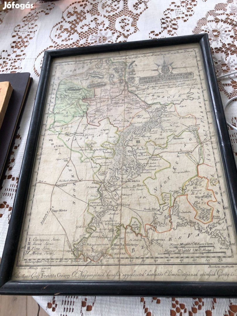 Heves és Külső-Szolnok egyesült vármegyék térképe Festetits Györgynek ajánlva. 25x34 cm keretben. 1798. Kézzel színezve.