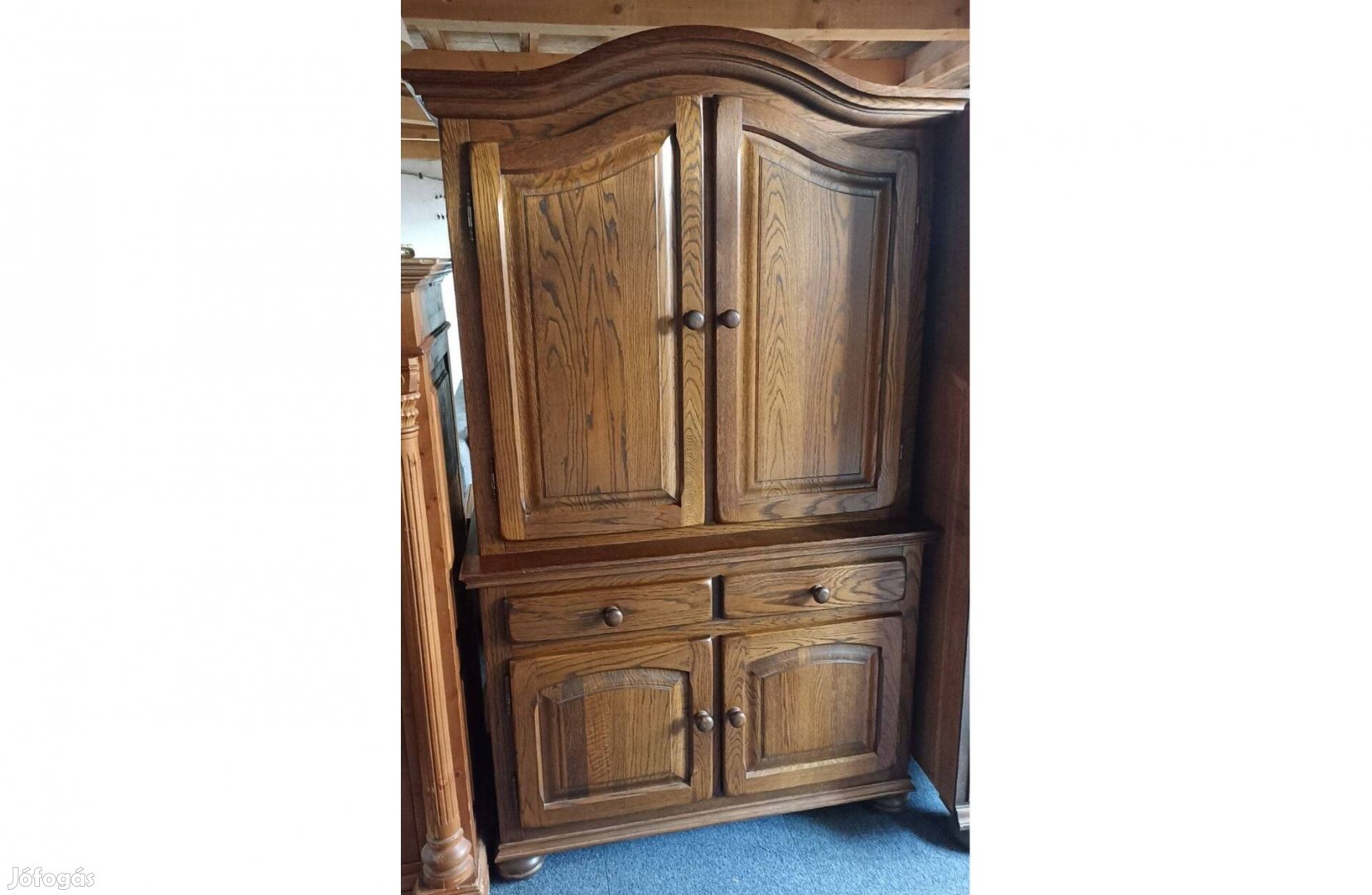 Eladó a képen látható, sötét tölgyfa, Holland tálalószekrény. A bútor alsó és felső részében is 1 polc van. A bútor használt, de kitűnő állapotú.