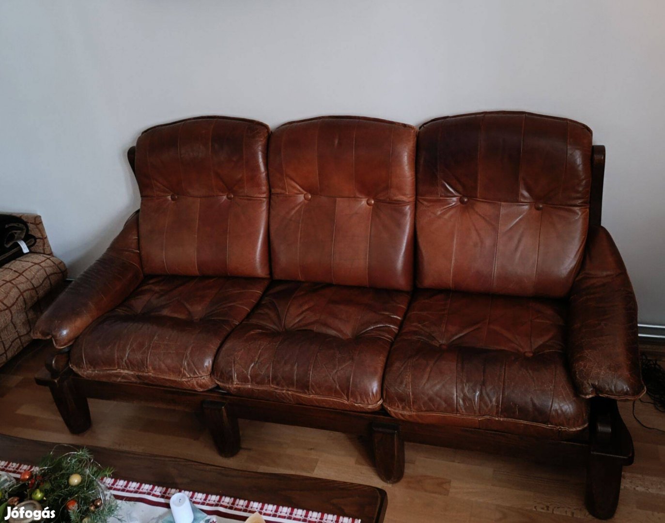 Bőr kanapé és két fotel eladó. Holland bútor, párnákra szétszedhető. A fa tökéletes állapotban, a bőr a karfáknál régies.
