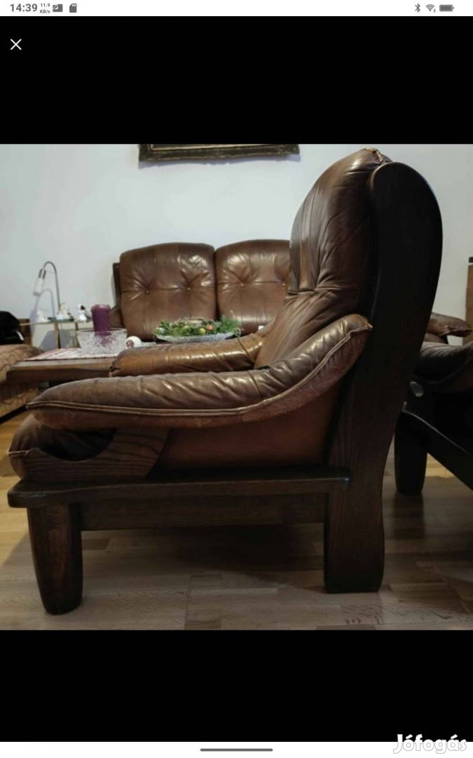 Kanapé és két fotel eladó. Holland bútor, párnákra szétszedhető. A fa tökéletes állapotban, a bőr a karfáknál régies.