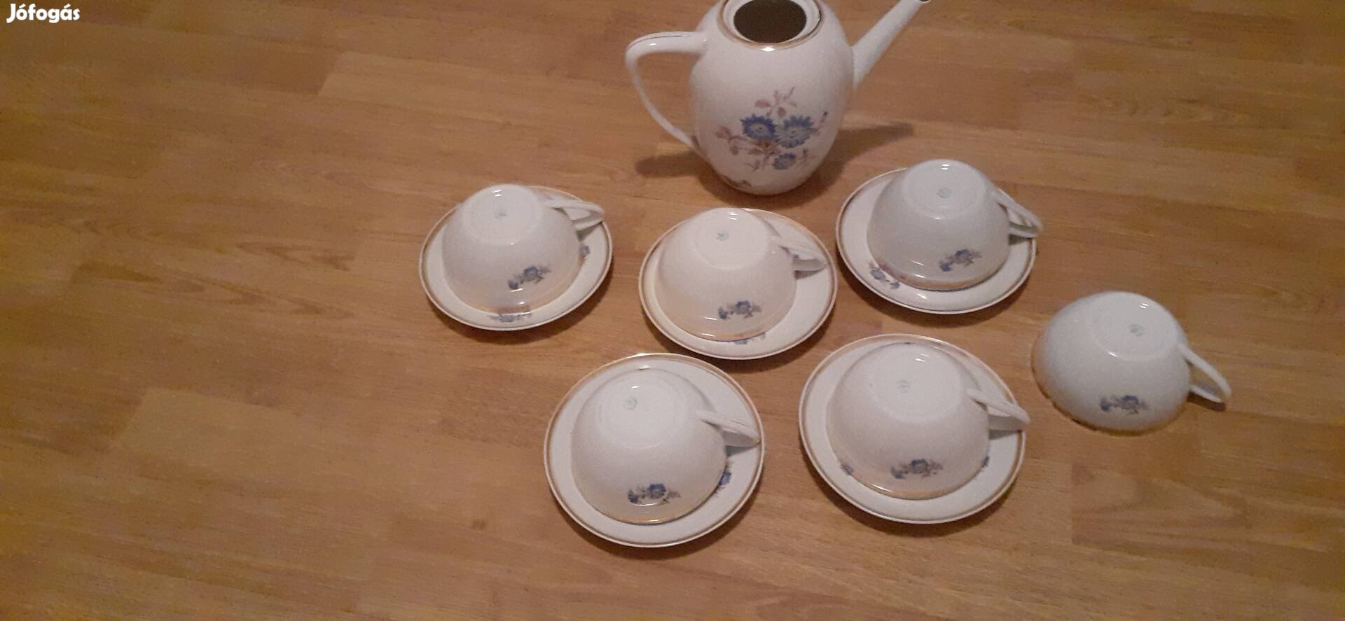 Hollóházi porcelán teáskészlet,hiányos állapotban,1db teás kiöntő tető nélkül,6db.csésze,5db csésze tányérral eladó.kiöntő 17cm magas, 41cm átmérője,csésze 6cm magas,34cm átmérő,tányér 15cm átmérőjű.Búzavirág mintával,aranyozott széllél.Az egyik csésze széle csorbult,pótlásra alkalmas.