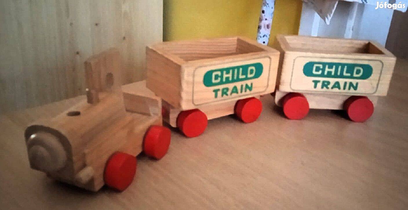 A vonat természetes, fából készült, a kerekek pirosra vannak festve.