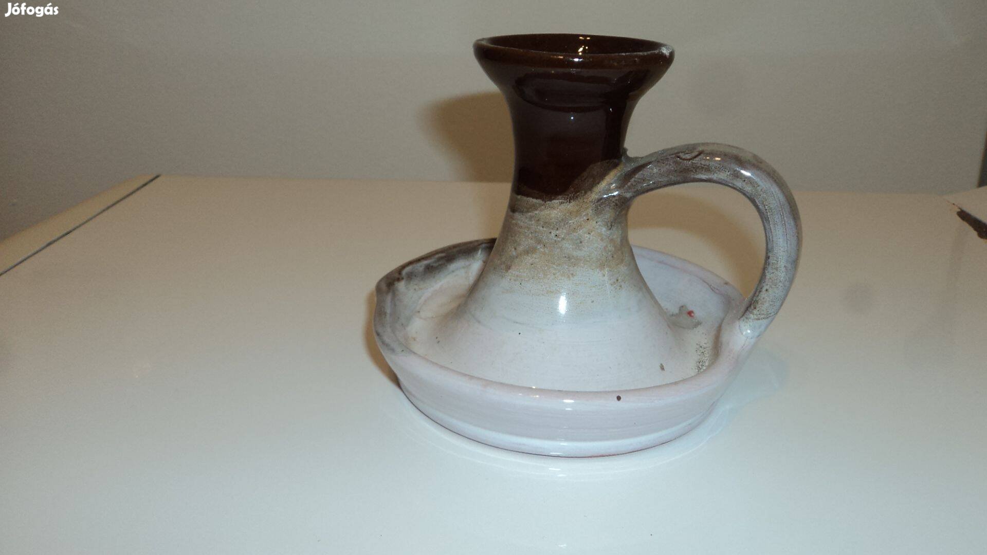 Gyertyatartó kerámiából, füllel és csepegő viaszfelfogóval.