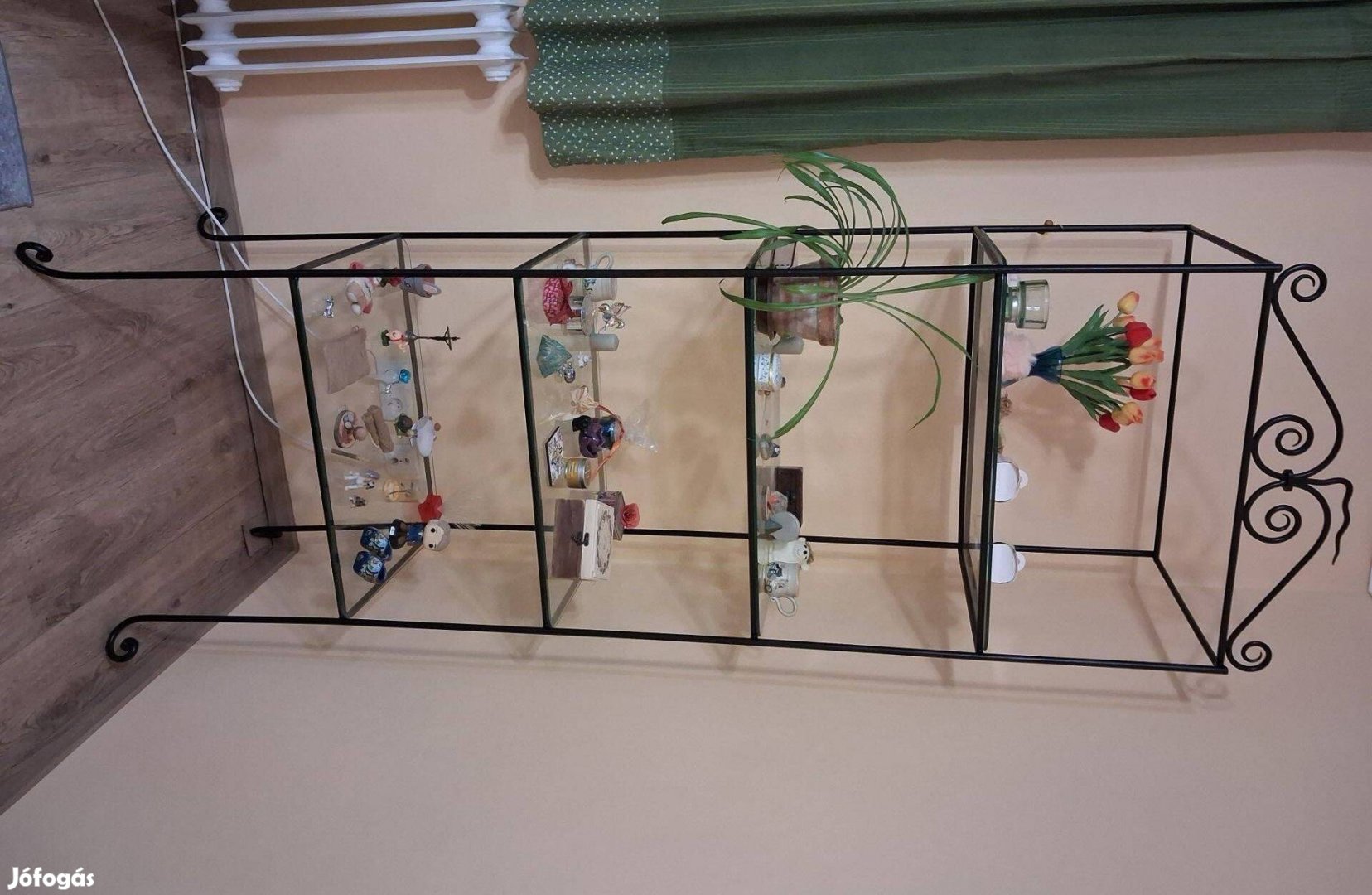 Eladó kovácsoltvas szerkezetű üveglapos polc. Üveglapokon apró karcolások használatából eredően, de összességében jó állapotú.