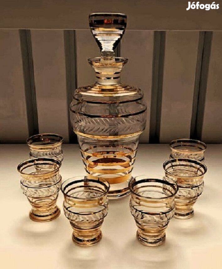 Csodás formavilágú, csiszolt, art deco századközepi különleges rövid italos készlet hibátlan állapotban. Minőségi, luxus kivitelben. Elegáns arany díszítéssel, körben csiszolt levélmintával.