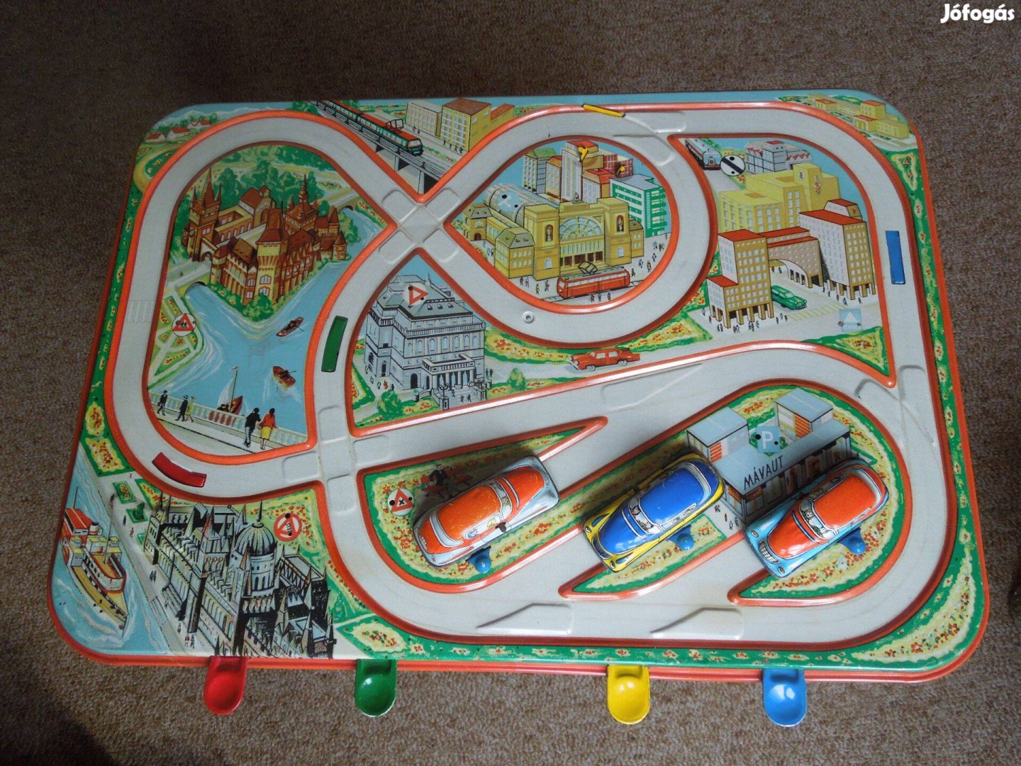 Lemezárugyáras közlekedési játék. Az egyik autó nem működik