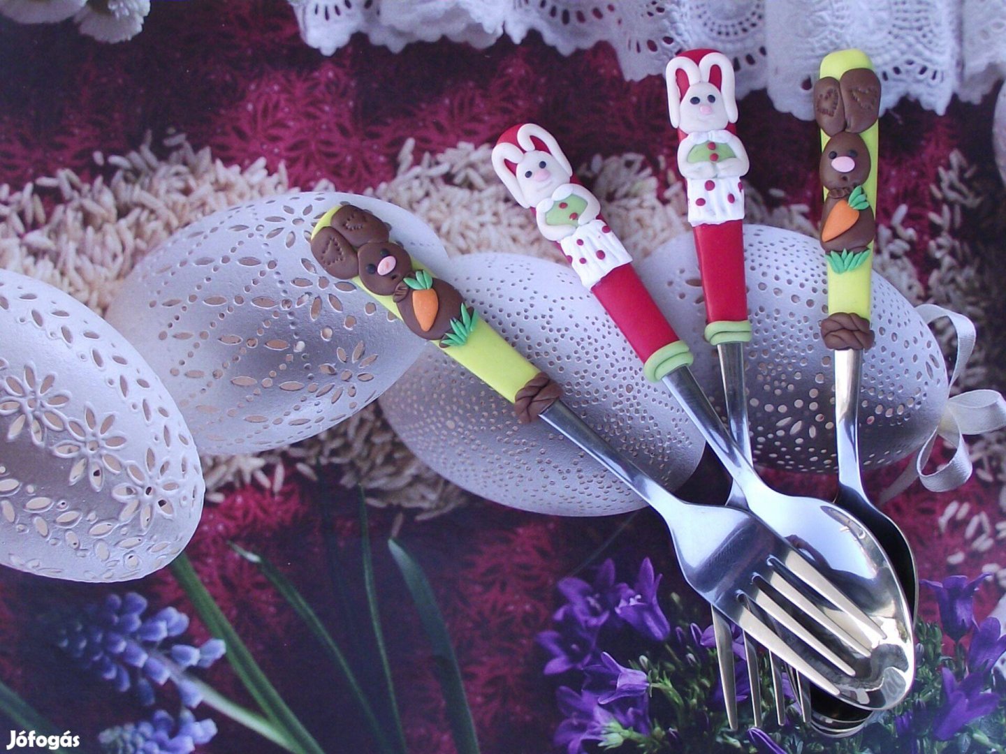 Süthető gyurmával díszített sütivilla és teáskanál szett 4 db-os nyuszi mintával.