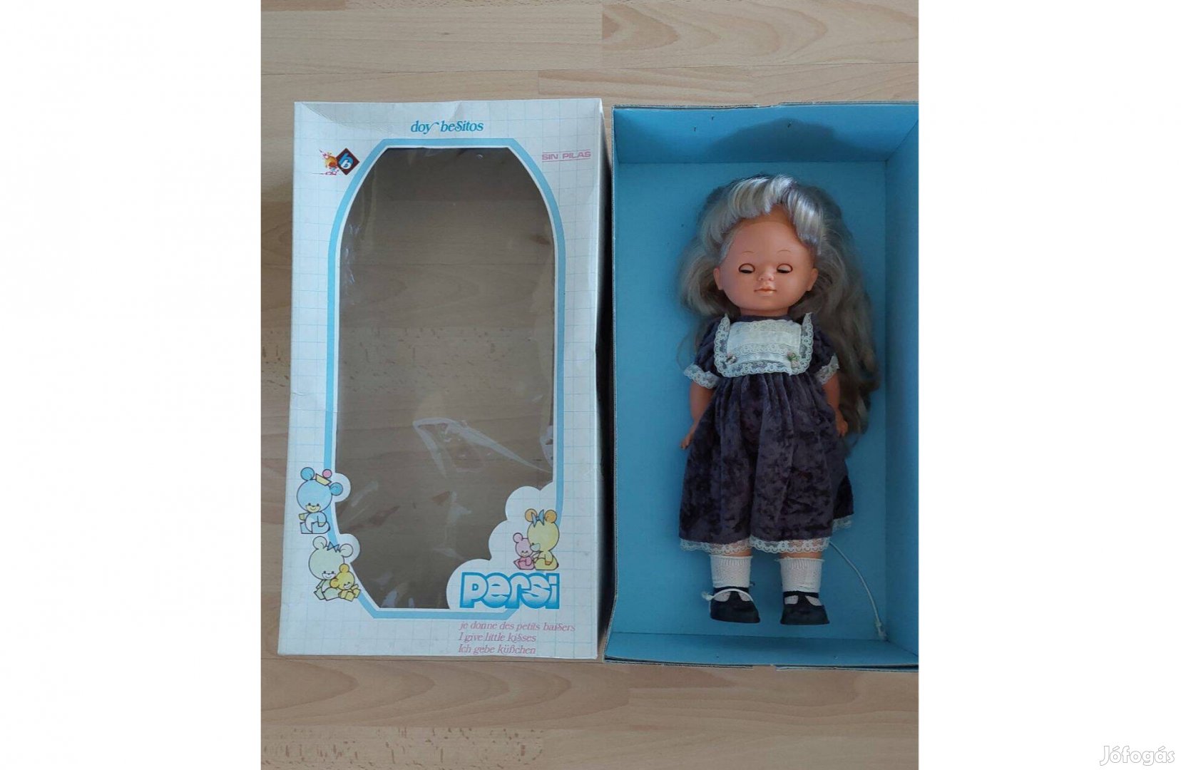 Persi bársonyruhás, minőségi spanyol játékbaba, 40 cm magas