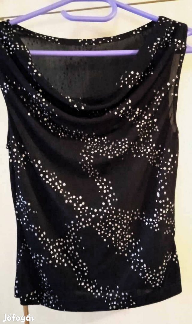 Eladó a képeken látható, pille könnyű, ujjatlan, elasztikus alkalmi felső. Mérete M. Kissé áttetsző anyag, de az ezüst csillogó díszítéssel és a fekete szín miatt inkább csak sejtetős. Nagyon csinos, bármilyen egy színű szoknyával, nadrággal.