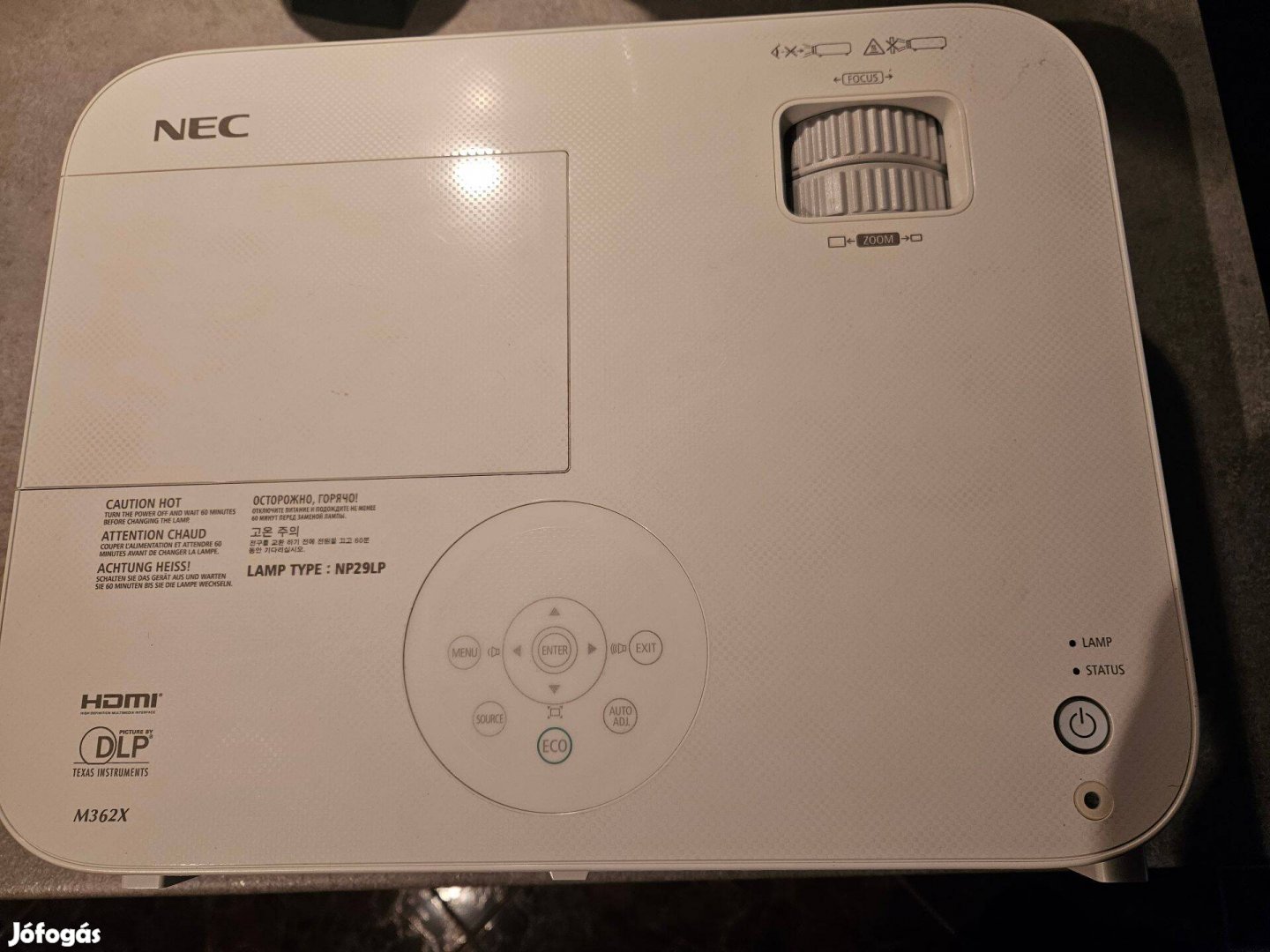 NEC M362X távirányítóval 460 használt lámpaórával 87% fennmaradt lámpaóra élettartalommal.