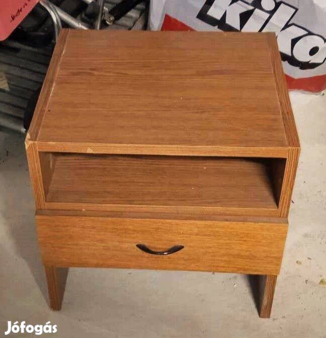 Eladó a képeken látható egy fiókos masszív, retro éjjeliszekrény. Korához képest nagyon szép állapotban, a hátsó címke szerint 1994-es. Több, mint 30 éves. Szerkezetileg kisfogástalan, a fedőlap sarokrészén vannak kis hibák. (fotó)