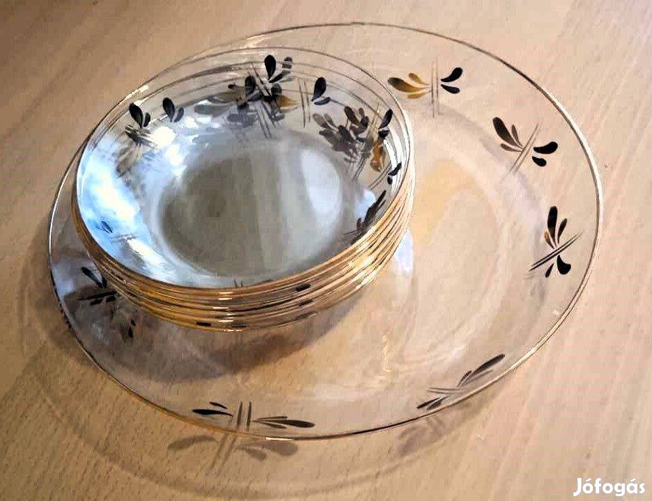Salgótarjáni arany-fekete díszes, régi süteményes üvegkészlet