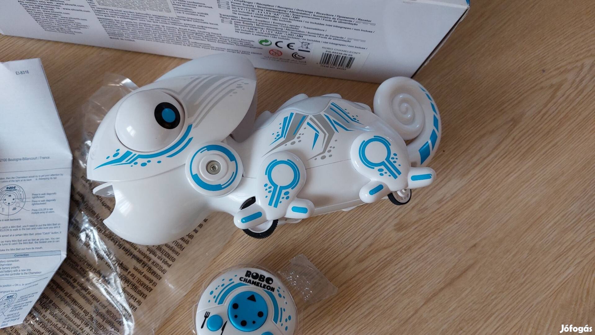 Távirányítós Robo kaméleon egy fehér színű kaméleon robot, aki váltakozó színekben tud pompázni. A kaméleon feje és háta világít, járás közben a szemei és a farkincája mozog, a kaméleon nyelvét külön tudod irányítani.