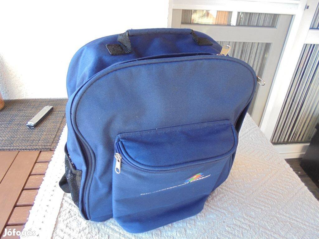 Eladó egy fiú iskolás hátizsák-iskolatáska a képek szerinti állapotban. Tetején kétfelé húzható cipzár, a táska teljesen szétnyitható. Oldalsó italtartó hálós zsebek, elöl hőszigetelős cipzáros zseb. Hátsó pántok állíthatók. Tetején fül.
