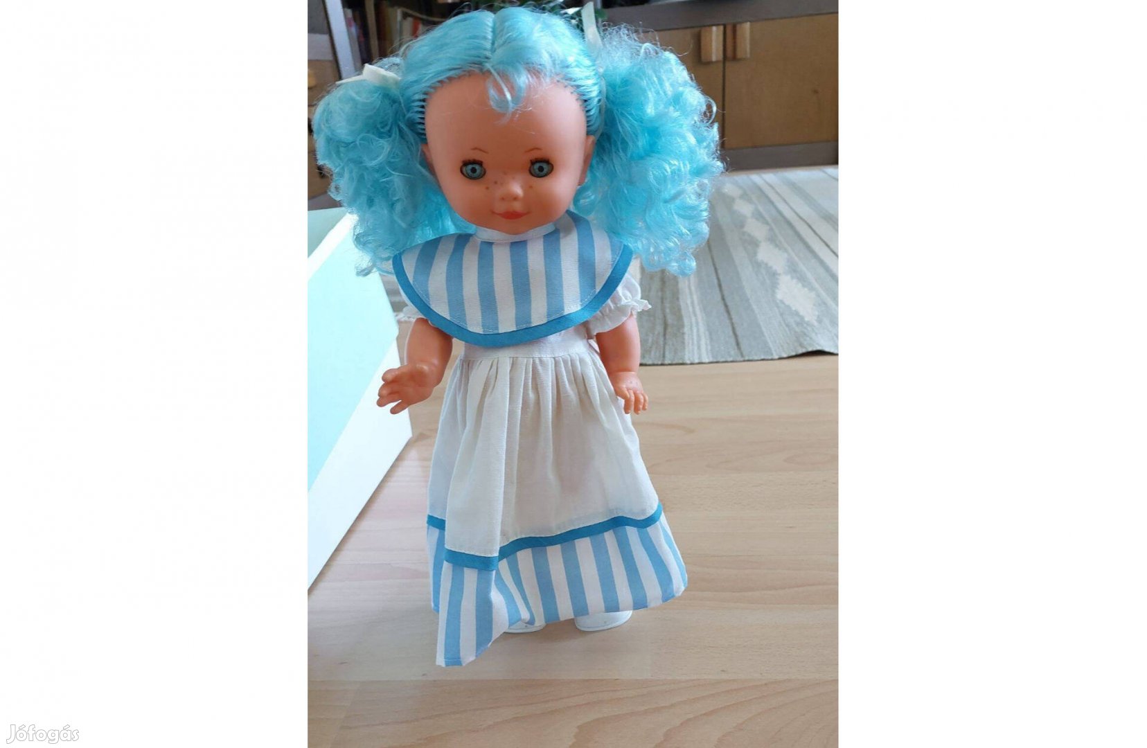 Spanyol, kékhajú, játék baba, 39 cm magas