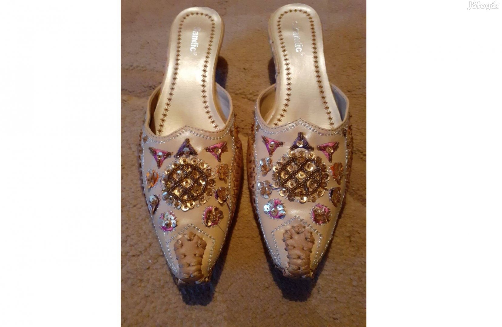 A fotón látható új papucs ami valódi bőrből készült a felső része nagyon csinos. utcai viselésre is alkalmas. nekem a mérete kicsi lett ugy kaptam horvát országból ajándékba a rokonoktól ahol nagyon drága volt. Egyszer sem volt a lábamon. Aki megvásárolja az nagyon jól jár vele mert egyedi darab. próba lehetséges ha közel vagy Pécshez. telefonon elérhető vagyok . .- Postázást is vállalok.