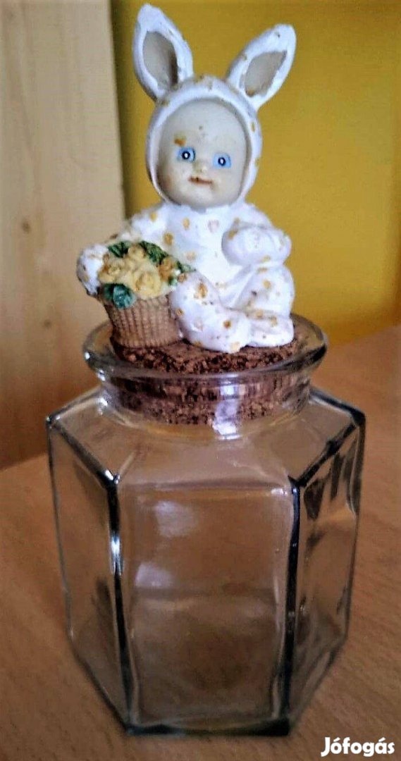 Üveg tároló tetején egy nyuszioverálos babyfigura