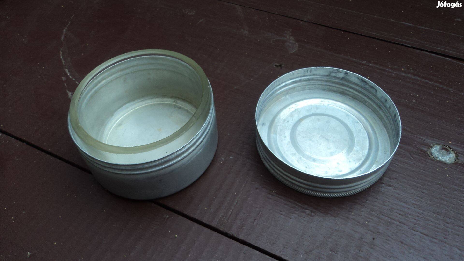 Üvegtégely (retró) fém külső borítással, csavaros tetővel, élelmiszer tárolására, hűtőbe történő tárolásra, kirándulásra, stb. Praktikus!