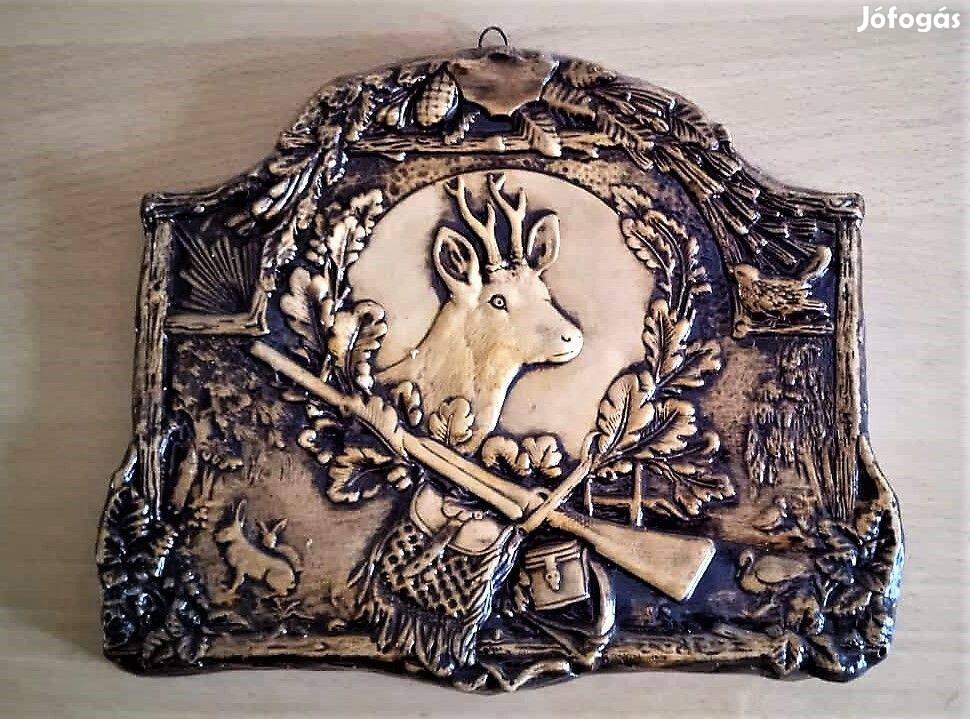 Eladó a képeken látható vadászati témájú, szarvast ábrázoló domborműves falikép. Anyaga talán gipsz. Valószínűleg Lengyelországból.