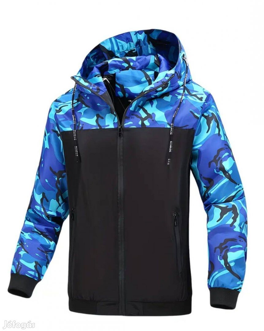 Vadiúj, M-es méretű, kapucnis, terepszínű, férfi szélkabát, hosszú ujjú, cipzáras, 2 oldalzsebbel. Nagyon szép, pont mint a fotókon.