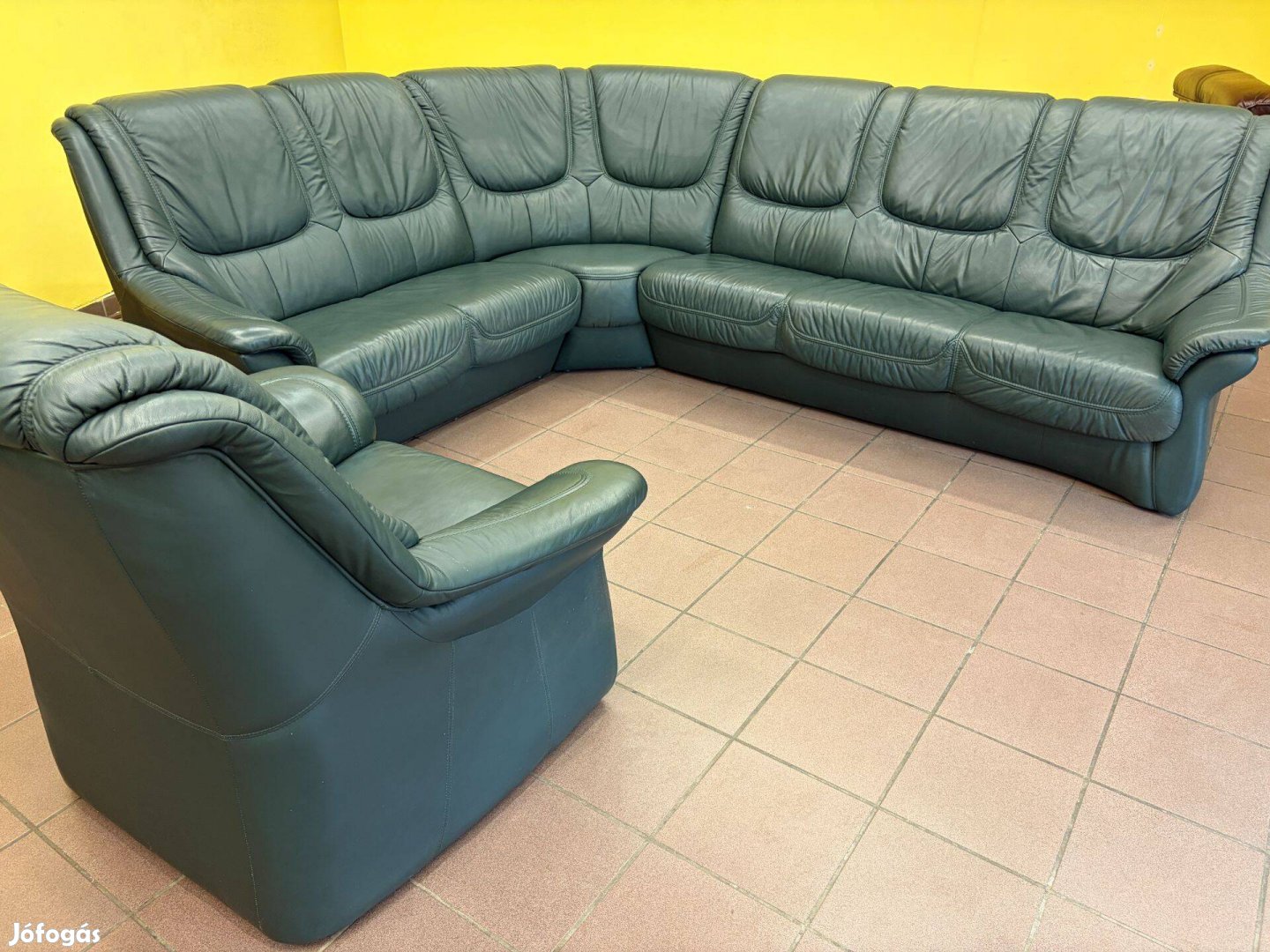 Valódi marhabőr sarokülőgarnitúra + fotel, újszerű állapotban, sötét-zöld színben. Áll egy háromszemélyes, egy kétszemélyes kanapéból, a sarokrészből és egy fotelból. Mindegyik részének a hátulja is bőr, így szabadon állíthatók a térben.