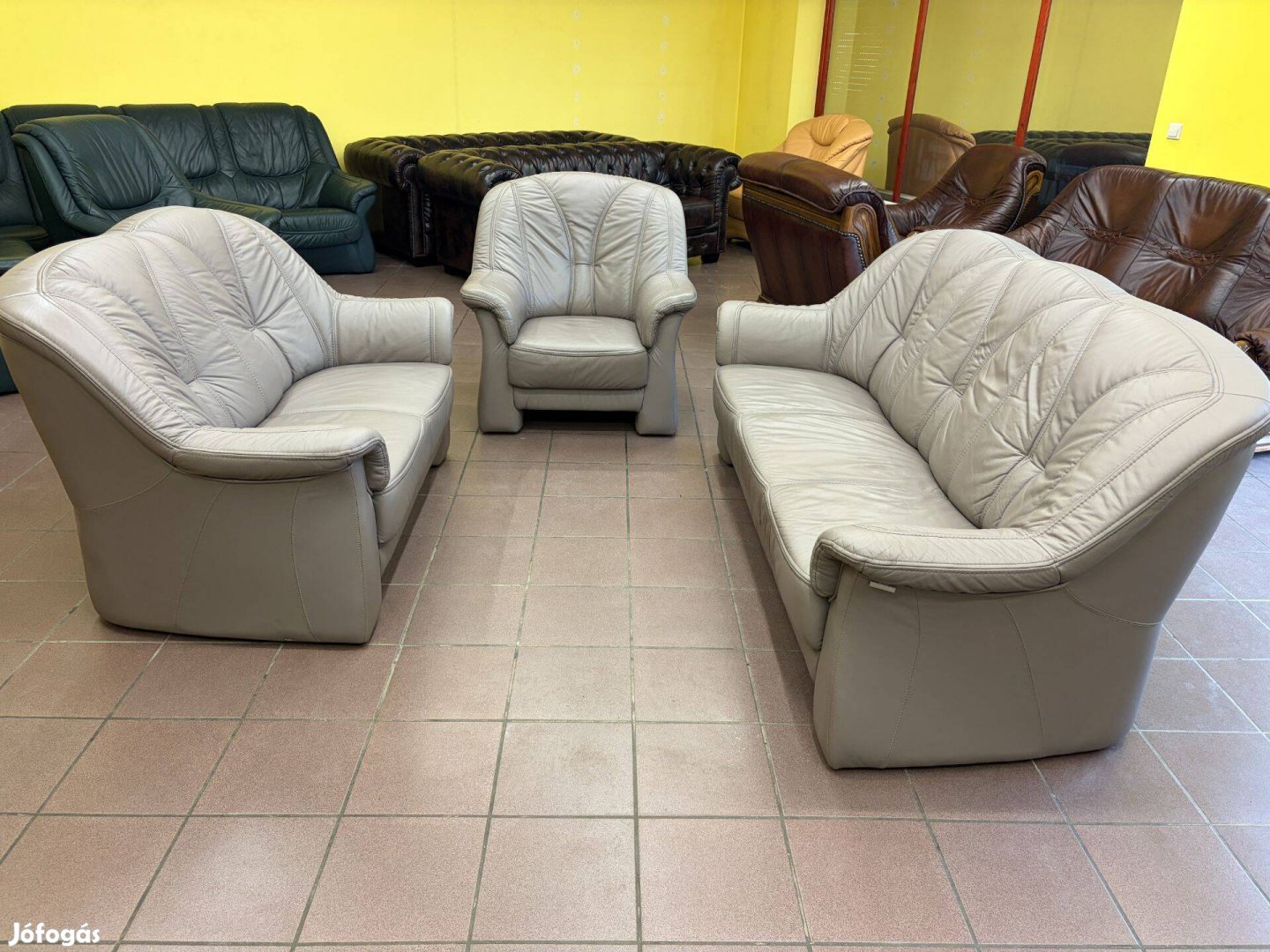 Valódi marhabőr ülőgarnitúra újszerű állapotban, delfin-szürke színben. Áll egy háromszemélyes, egy kétszemélyes kanapéból és egy fotelból. Mindegyik részének a hátulja is bőr, így szabadon állíthatók a térben.
