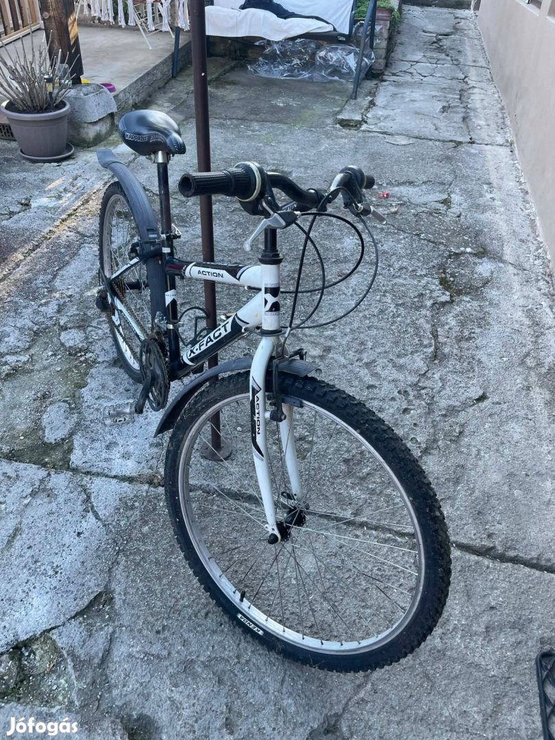 Eladó a képeken látható X-Fact Action típusú, 26 colos kerekekkel szerelt hegyi kerékpár. A bicikli hosszabb ideig tárolva volt, ezért felújítást igényel. A bicikli lánca kicsit rozsdás, a festék néhol kopott. Hozzá tartozik a víztartó, a fékek jól működnek. A nyereg hátsó része kicsit szakadt, ami az egyik képen látható is.
