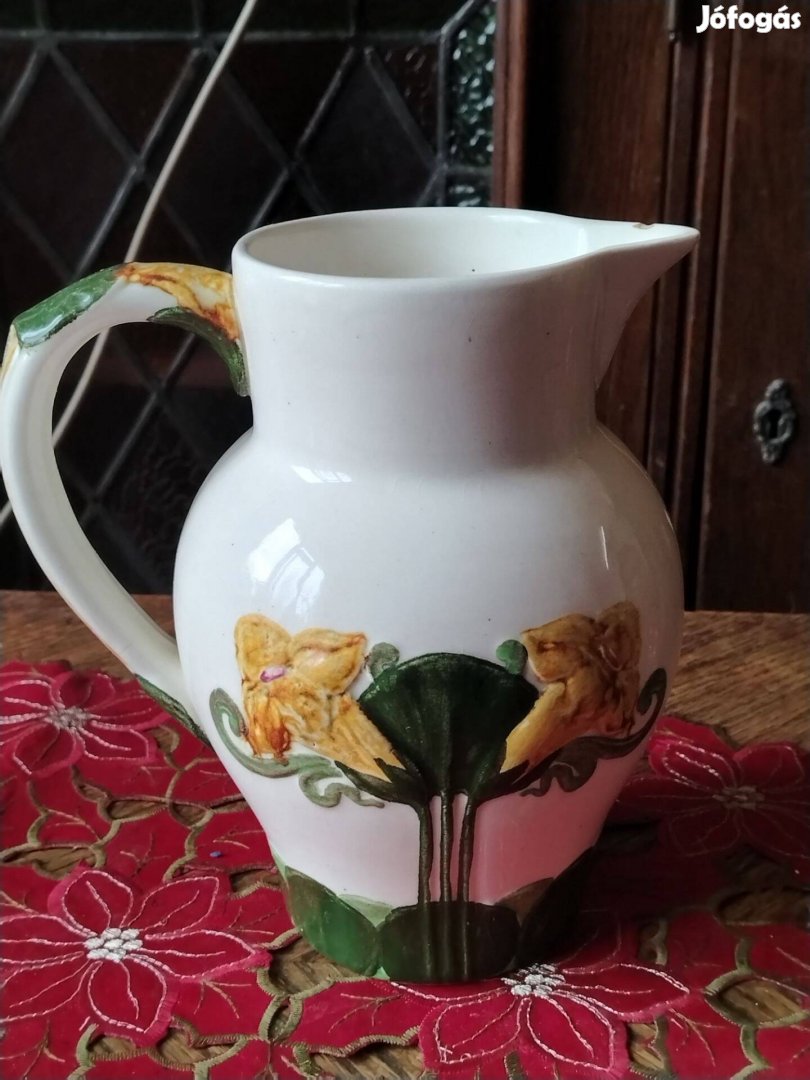 Zsolnay antik kancsó, az 1800-as évek végéről. Gyönyörű plasztikus, kidomborodó virág mintával. Magassága 20 cm. A kancsó csőrénél van egy minimális sercenés és az alján hajszálrepedés (fotózva) Jelzett, mázba nyomott Zsolnay Pécs jelzéssel. Formaszám 7432