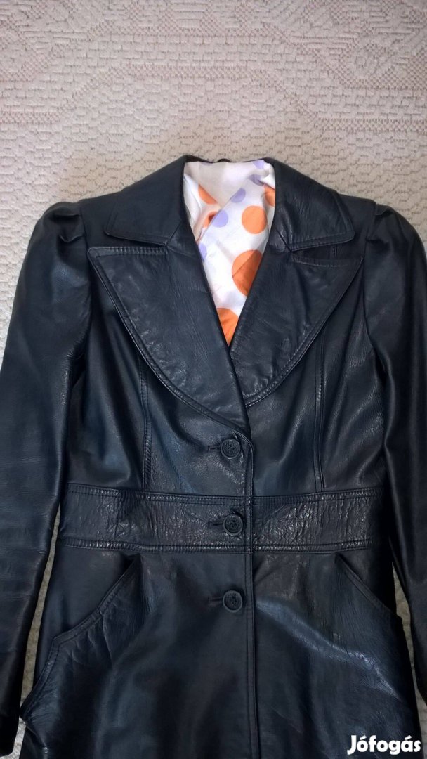 "S"-es méretű, nagyon elegáns, kék színű, alig használt, megkímélt, hosszú valódi bőrkabát.