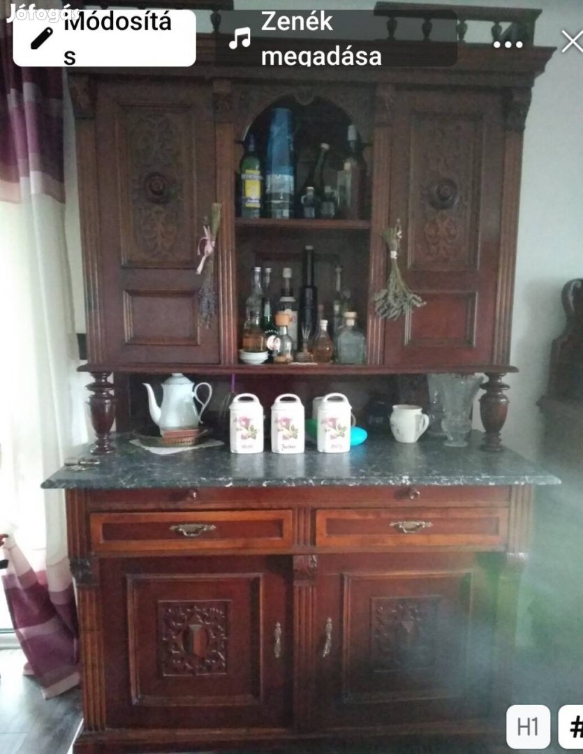 Restaurált ónémet tálalószekrény fekete márványpulttal