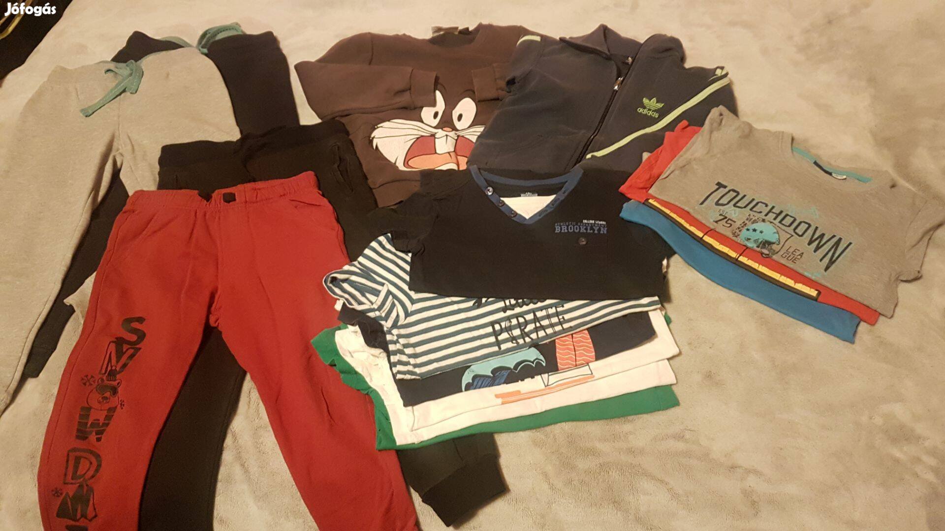 Eladó a képeken látható fiú gyermek ruhák. 110 - 116 -os méretűek. Van benne egy barna hosszú ujjú felső, egy sportos cipzáros felső, három vékony hosszú ujjú felső, hat póló, négy szabadidő nadrág. A ruhák használtak, de használhatók. Ára: 3000,;