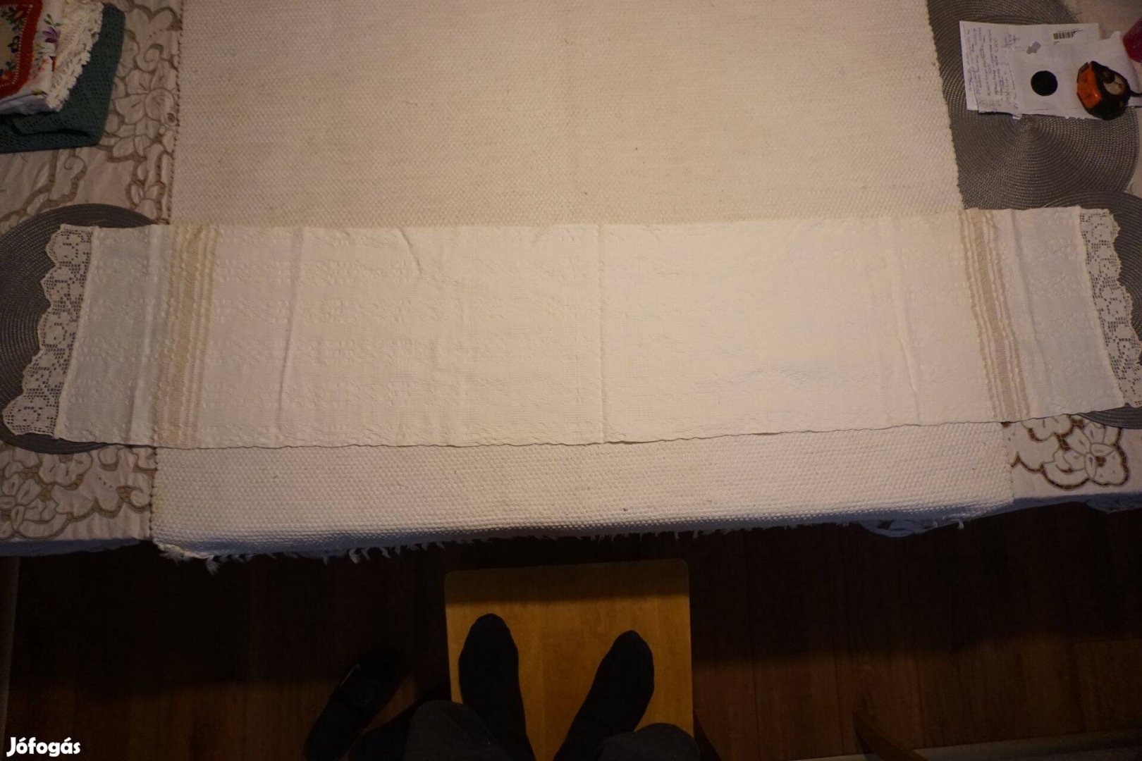 A két végén csipkével, és szürke csíkokkal van díszítve.