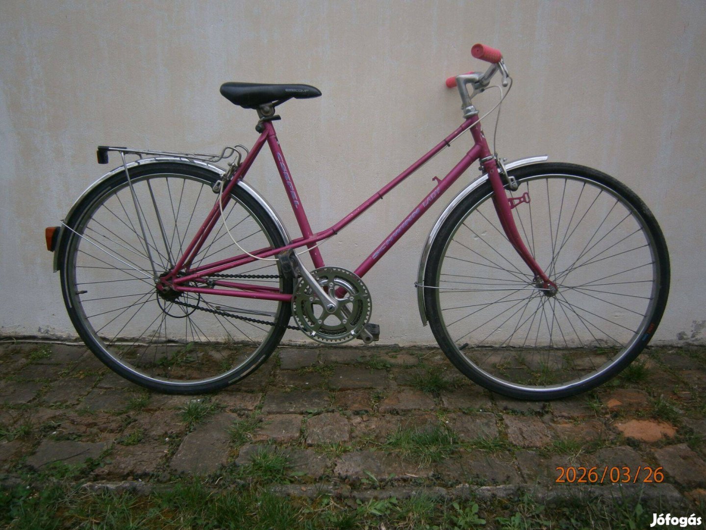 28-as Csepel Lady női kerékpár keresi új gazdáját. A kerékpár azonnal használható állapotban van. Fékek agyak gumik rendben vannak rajta. Az eredeti 630-as 2*5 sebességes kerekeket 622-esre cseréltem a nagyobb gumiválaszték miatt. A hátsó kerék egy tisztitott és újrazsirzott 3 sebességes agyváltóval szerelt kerék kontrafékkel. igy a gépen három fék is van. A váltó rész is működik de nincs bekötve állandó harmadik sebességben fut. A régi fekete markolatokat szinben passzolósabbra cseréltem. A lánc új. Hátsó csomagtartó és sztender segitik a kényelmesebb használatot.Nem postázom. Az ára fix.