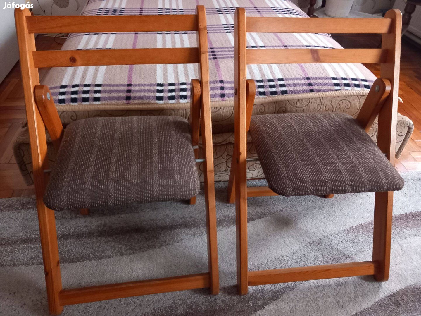 2 db összecsukható, kárpitozott, natúr fenyő szék újszerű