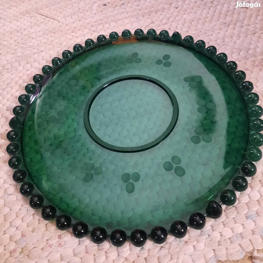 Antik smaragdzőld,bütykösperemű üveg tortakínáló