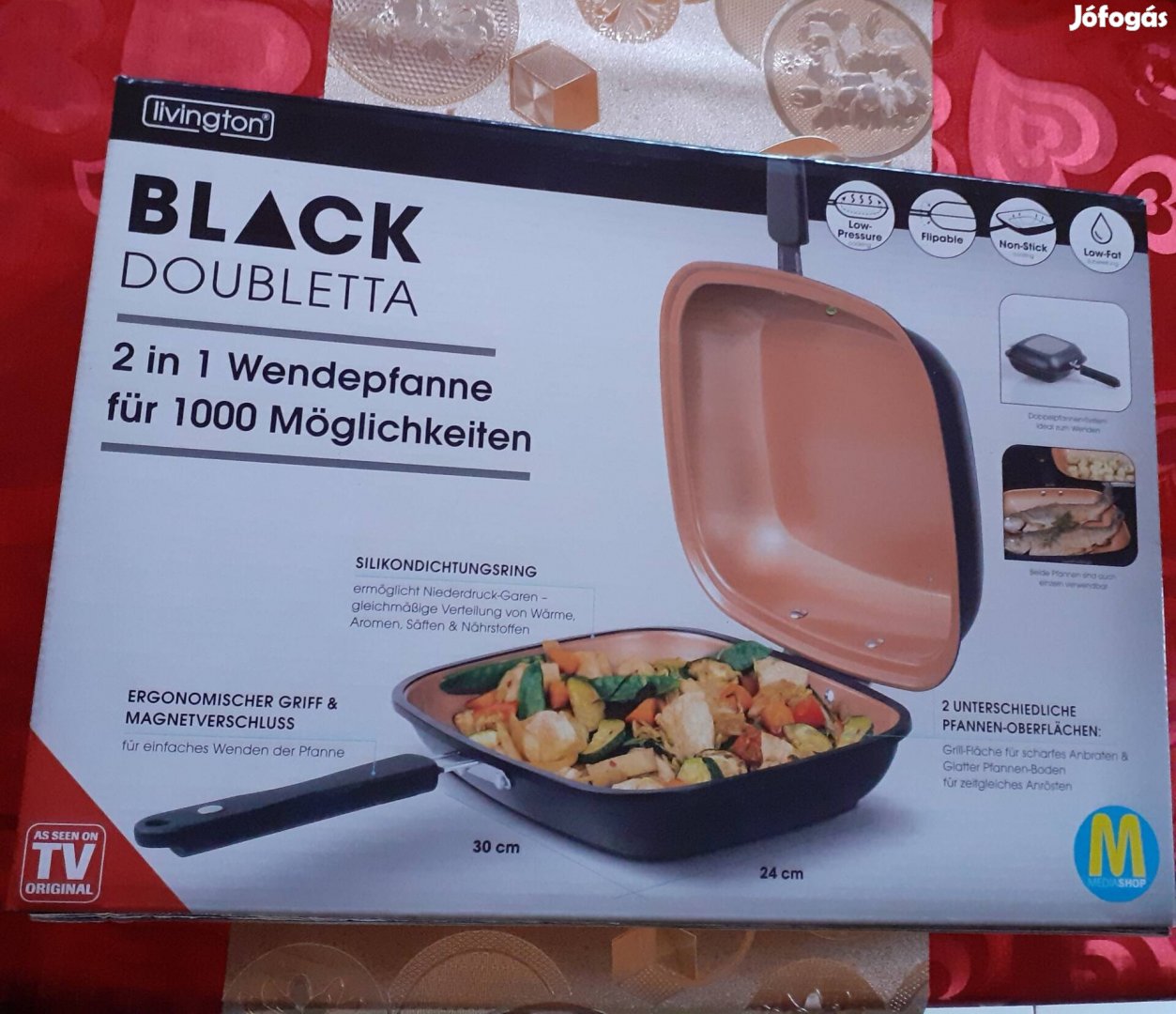 Eladó a képeken látható vadonatúj sosem használt Livington Black Doubletta átfordítható serpenyő. Ideális főzéshez, sütéshez, pároláshoz, grillezéshez. Ergonomikus fogantyú innovatív mágneses zárral. Mérete 30 cm x 24 cm. Máshol is hírdetem.