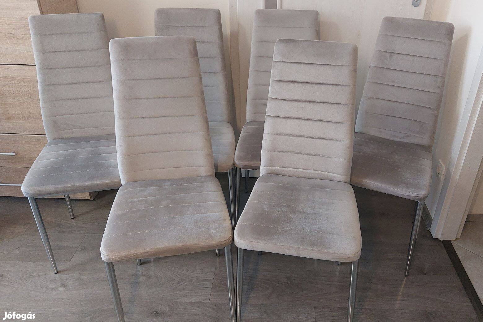Eladó a képeken látható 6db bézs bársony kárpitozású étkezőszék, krómozott lábakkal. Szakadás és foltmentes. Csak Egyben eladó!